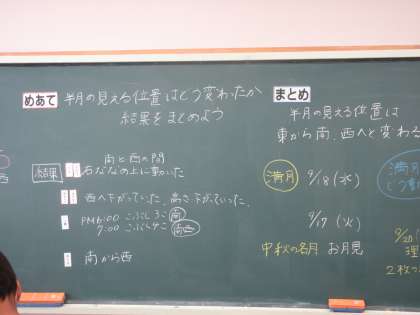 9月17日(火) 4年理科【進んで学ぶ子】 公開日 2024/09/17 更新日 2024/09/17 できごと めあて「半月の見える位置は、どう変わったか結果をまとめよう」を立て、一晩の半月の動きを見て結果をまとめました。