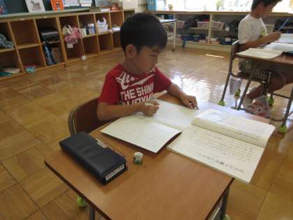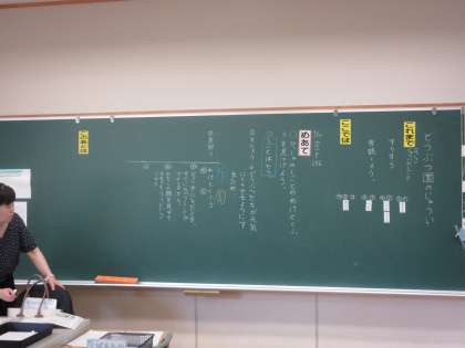 「どうぶつ園のじゅうい」で、めあて「ひっしゃのしごとのわけとくふうを見つけよう」を立て、治療と見回りの訳と工夫をまとめました。