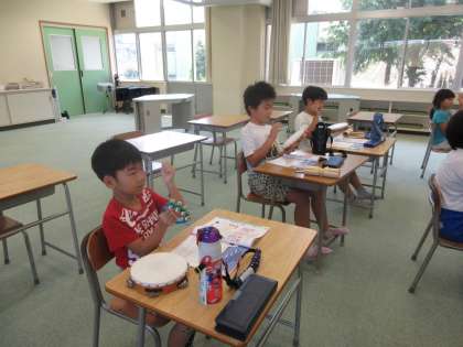 9月17日(火) 2年音楽【進んで学ぶ子】 公開日 2024/09/17 更新日 2024/09/17 できごと めあて「3びょうしの はくにのって リズムをうとう」を立て、カスタネット、タンバリン、ウッドブロック、トライアングル、鈴などを使ってリズム打ちを練習したり、「いるかはざんぶらこ」の曲に合わせてリズム打ちをしたりしました。