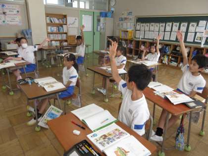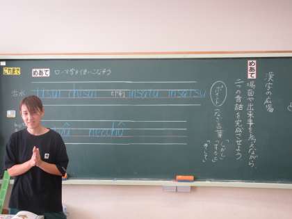 ローマ字に学習をした後、「漢字の広場」で、めあて「場面や出来事を考えながら2つの昔話を完成させよう」を立て、「おむすびころりん」「浦島太郎」の場面絵をもとに、つなぎ言葉を使いながらお話作りを行いました。