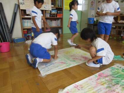 「ぺったんコロコロ」で、身近な材料等を使って模造紙に自由に模様を描きました。