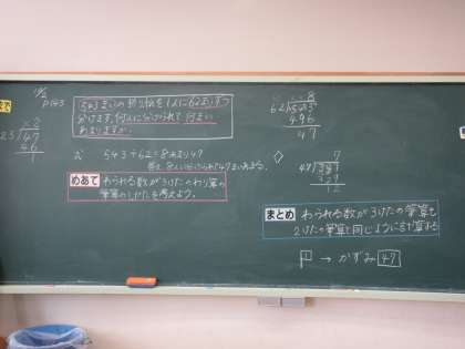10月2日(水) 4年算数【進んで学ぶ子】 公開日 2024/10/02 更新日 2024/10/02 できごと めあて「わられる数が3けたのわり算の筆算にしかたを考えよう」を立て、教科書の問題をもとに、どのようにすればよいかを考えました。