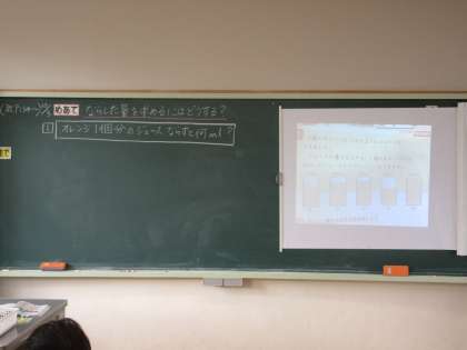 めあて「ならした量を求めるにはどうする?」を立て、教科書の問題をもとに考えました。