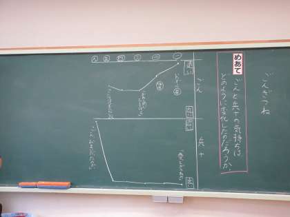 10月9日(水) 4年国語【進んで学ぶ子】 公開日 2024/10/09 更新日 2024/10/09 できごと めあて「ごんと兵十の気持ちは、どのように変化したのだろうか」を立て、これまでの場面ごとに読み取ってきたことをもとにして、心情曲線で表し気持ちの変化を捉えました。