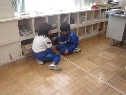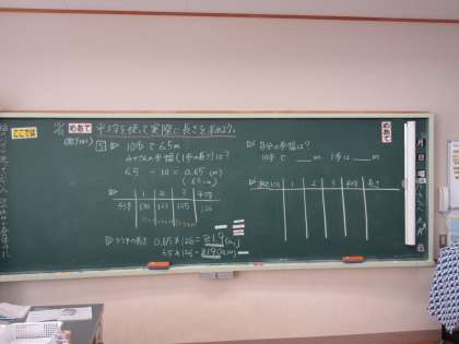 10月11日(金) 5年算数【進んで学ぶ子】 公開日 2024/10/11 更新日 2024/10/11 できごと めあて「平均を使って実際に長さを求めよう」を立て、廊下や教室の長さを歩幅を使って計測して平均値を出し、実際の長さと比べ合いました。