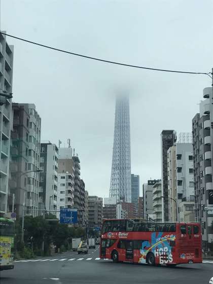 間もなくスカイツリーに到着します。あいにくの天気で上の方は雲の中に隠れてしまっています。