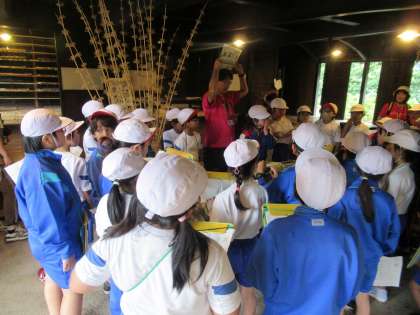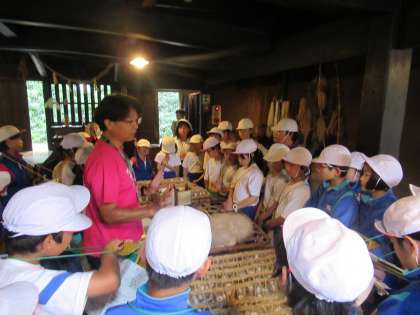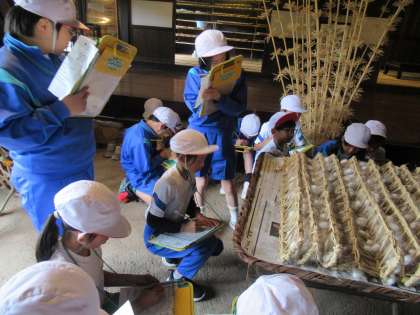かやぶき農家の見学です。講師の先生の話をよく聞いて、たくさんメモをとることができました。