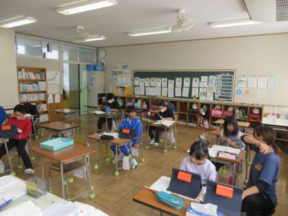 10月22日(火) 4年算数【進んで学ぶ子】 公開日 2024/10/22 更新日 2024/10/22 できごと 「変わり方」の学習に取り組んでいます。今日は、棒で階段型を作ったときの階段数の数と使う棒の数がどのように変わっていくかを考えました。タブレットを活用し、棒を簡単に移動させることで思考を整理することができました。