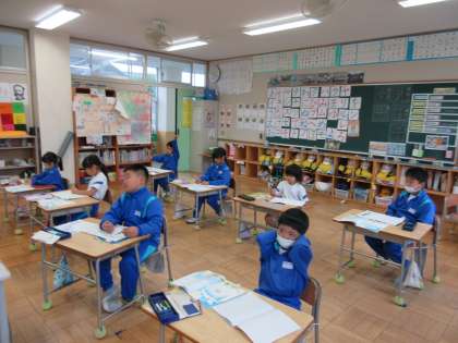 10月23日(水) 1年国語【進んで学ぶ子】 公開日 2024/10/23 更新日 2024/10/23 できごと 物語文「くじらぐも」の学習を進めています。登場人物の気持ちを考えて、それをもとに上手に音読ができるよう、頑張っています。