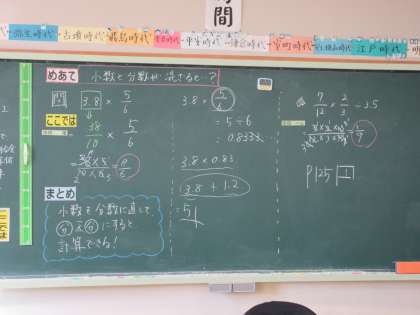 10月24日(木) 6年算数【進んで学ぶ子】 公開日 2024/10/24 更新日 2024/10/24 できごと 分数と小数が混じった計算の仕方を考えました。より早く簡単に計算するには、小数を分数に直して計算する方がよいことに気付きました。