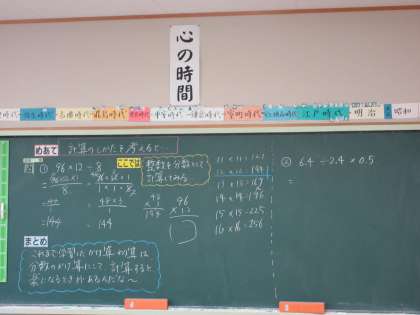 10月25日(金) 6年算数【進んで学ぶ子】 公開日 2024/10/25 更新日 2024/10/25 できごと 分数の割り算の学習を進めています。今日は整数の計算で、かけ算と割り算が混じった計算の仕方を考えました。整数同士の計算でも、分数に直して計算すると速く簡単にできることを理解することができました。