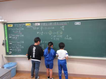 10月29日(火) 5年算数【進んで学ぶ子】 公開日 2024/10/29 更新日 2024/10/29 できごと めあて「分数を小数で表すにはどうする?」を立て、これまでの学習をももとに、分数をわり算の形に直す方法に気付き、問題に取り組みました。