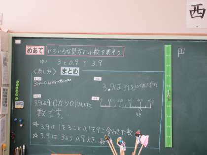11月7日(木) 3年算数【進んで学ぶ子】 公開日 2024/11/07 更新日 2024/11/07 できごと 小数の学習を進めています。今日は、小数の大きさはについて、いろいろな表し方ができることを学びました。数の仕組みについての理解を深めることができました。