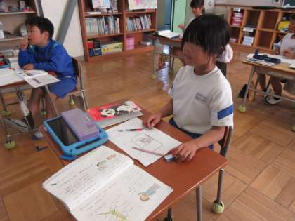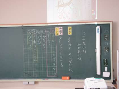 11月13日(水) 1年国語【進んで学ぶ子】 公開日 2024/11/13 更新日 2024/11/13 できごと 「しらせたいな みせたいな」で、知らせたいことの絵を前時までに描いてきたので、今日は、めあて「ぶんしょうでしらせよう」を立て、「かたち」「いろ」「さわりごこち」「うごき」など文章にする前段階の言葉集めをしました。
