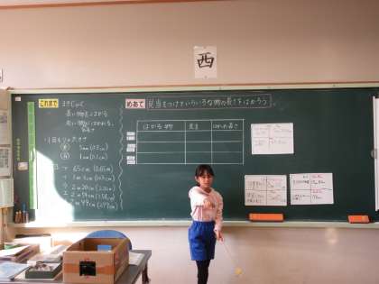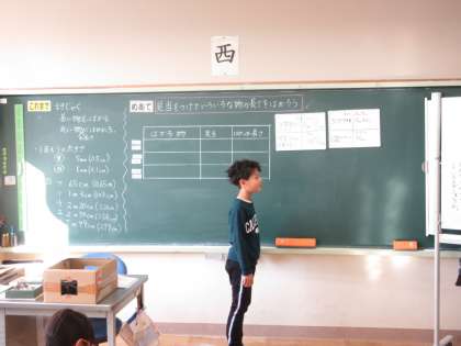 11月14日(木) 3年算数【進んで学ぶ子】 公開日 2024/11/14 更新日 2024/11/14 できごと めあて「見当をつけていろいろな物の長さをはかろう」を立て、校内にある物の長さを予想し、巻き尺を使って実際に長さを測りました。