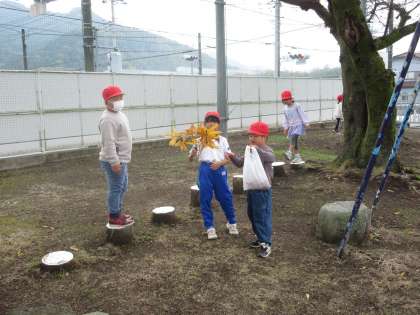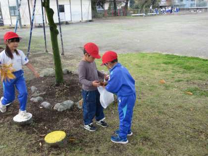 秋の自然を使ったおもちゃづくりに向けて、校庭で秋の自然集めをしました。