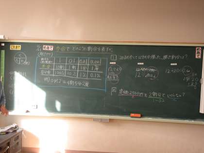 11月21日(木) 5年算数【進んで学ぶ子】 公開日 2024/11/21 更新日 2024/11/21 できごと めあて「歩合でどのように割合を表すか」を立て、小数、歩合。百分率を表にまとめながら歩合の表し方を学習しました。