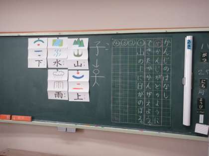 11月25日(月) 1年国語【進んで学ぶ子】 公開日 2024/11/25 更新日 2024/11/25 できごと 「かんじのはなし」で、めあて「かんじがどのようにできたか、かんがえよう」を立て、山や上、水、雨、下などの漢字の成り立ちについて絵を見ながら学習しました。