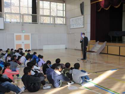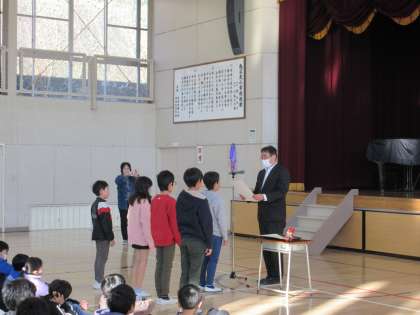 12月3日(火) 表彰・朝礼 公開日 2024/12/03 更新日 2024/12/03 できごと 業前の時間に、夏休みの課題や2学期の行事等において優秀な成績を収めた児童への表彰を行いました。朝礼では、校長先生より、自己の力を伸ばすためには、自分だけの考えではなく周りに目を向けて素晴らしいものを見たり、聞いたりすることが大切であることのお話がありました。
