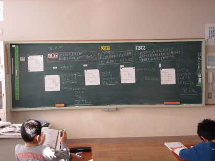 めあて「どんな工夫をすると、面積を求めることができるかな?」を立て、図形を分けたり補ったりして、これまで学習してきた長方形や正方形の公式を使って求められることを学習しました。