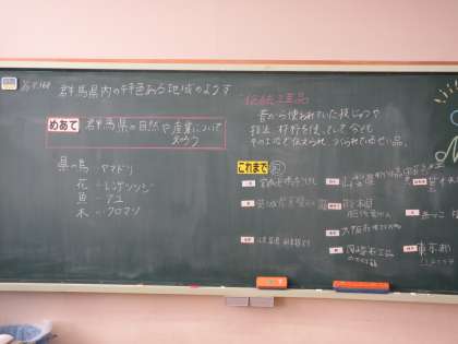 1月17日(金) 4年社会【進んで学ぶ子】 公開日 2025/01/17 更新日 2025/01/17 できごと 「群馬県内の特色ある地域のようす」で、めあて「群馬県の自然や産業について知ろう」を立て、県の鳥や花、魚、木などを知ったり、伝統工芸品について考えたりしました。