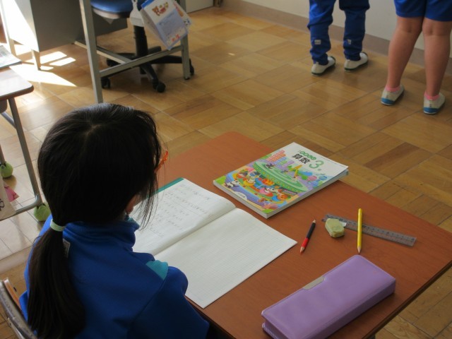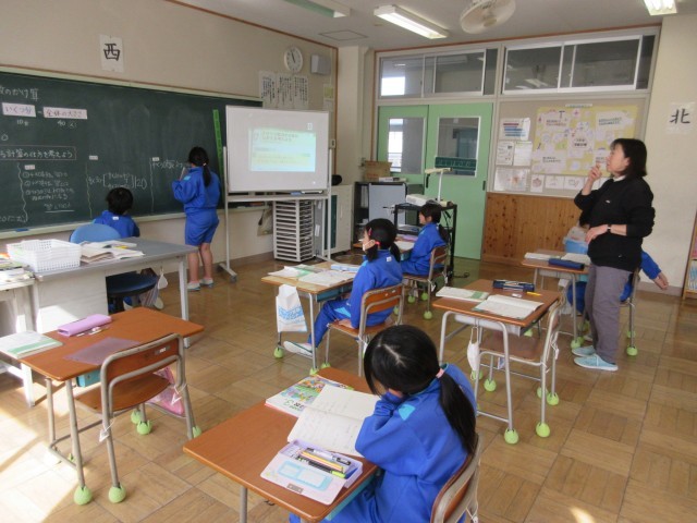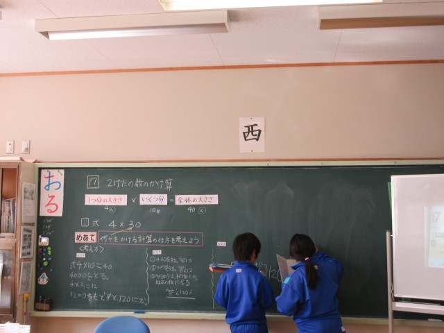 「2けたのかけ算」の学習で、本時は「何十をかける計算の仕方を考えよう」をめあてに学習に取り組みました。かけ算の式の意味を正確に理解し、それを踏まえて一人一人計算の仕方を考えました。みんなの考えを共有し、最終的にどのように計算するのがよいかまとめることができました。