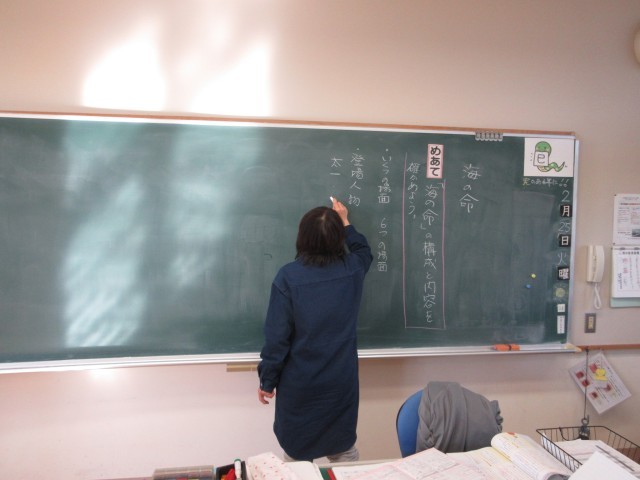 2月25日(火) ひびき国語【進んで学ぶ子】 公開日 2025/02/25 更新日 2025/02/25 できごと 「海の命」で、めあて「海の命の構成内容を確かめよう」を立て、「いくつの場面からできているか」「とうじょうじんぶつは」などから構成内容を確かめました。