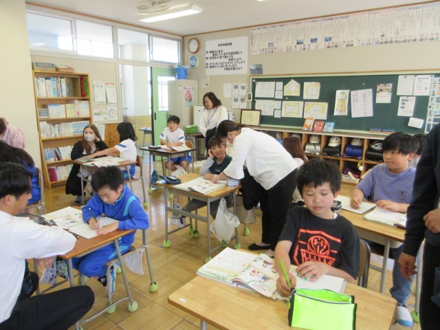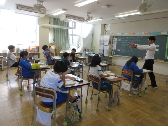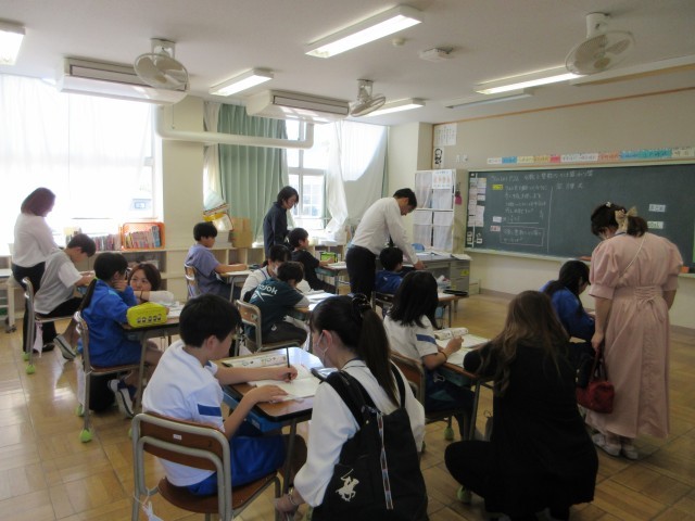 分数と整数のかけ算・わり算の単元に入りました。計算の仕方を,まず自分で考えます。それから,いつもは友達と共有しますが,保護者の方と共有することもできます。笑顔で楽しそうに話し合う姿が見られました。