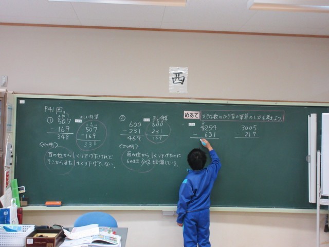 5月2日(金) 3年算数【進んで学ぶ子】 公開日 2025/05/02 更新日 2025/05/02 できごと 「大きな数のひき算の筆算の仕方を考えよう」をめあてに学習に取り組みました。3けたの数どうしの計算で、どのように繰り下げをするのかなどを考えながら、正確に解けるよう慎重に取り組むことができました。