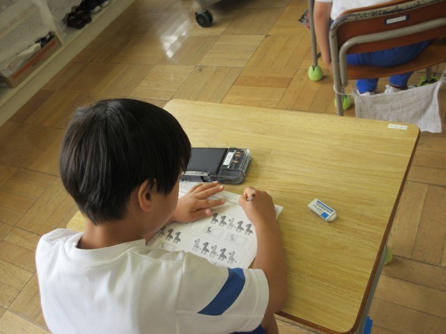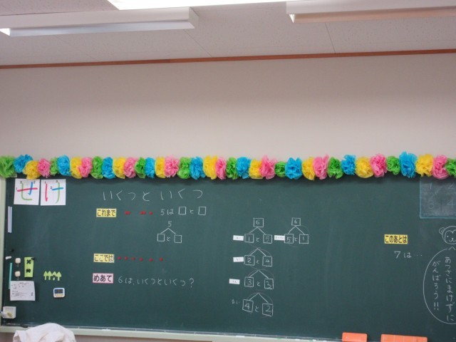 「いくつといくつ」の学習を進めています。今日は「6」はいくつといくつかを考えました。おはじきを使ったり、絵を見て考えたり、問題に集中して取り組むことができました。