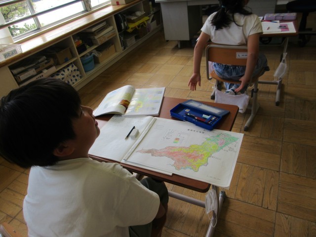 「白地図を見て市の特色を考えよう」をめあてに学習を行いました。藤岡市には、世界遺産があること、南側や西側の土地が高いことなど、自分が気付いた特色を発表し合うことができました。