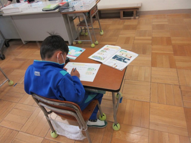 たしざんの問題づくりを学習しました。問題場面の絵から、文章問題を考えることは子どもたちにとって今までにない経験で難しさを感じていたようです。ヒントをもとに、自分で問題を作れたときはとっても嬉しそうでした。