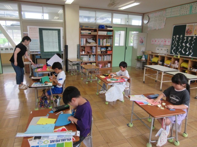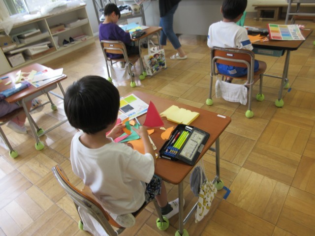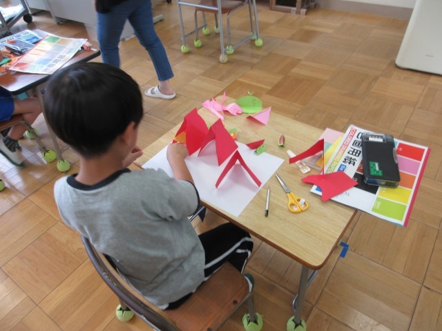 「おって、きって、たてて、かざりつけよう」をめあてに学習を進めました。自分が作りたいものを想像し、好きな形に切って、折って、立てました。おうちの中に小鳥がいたり、大きな木を作って立てたり、とっても楽しそうに活動していました。