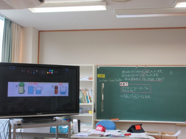 「かさ」の学習に取り組んでいます。本時のめあては「かさの計算はどのようにするのか」です。文章問題を図に表し、問題理解をして、どのような計算になるのか考えました。個々で考えた後、それぞれの考えをペアで伝えたり、分からない友だちに教えてあげたり学び合いも充実しています。