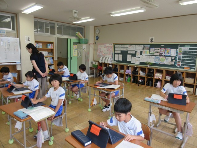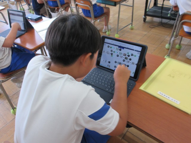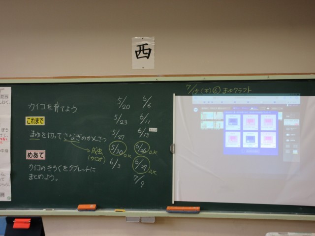 「かいこをそだてよう」をテーマに学習に取り組んでいます。いよいよまとめの段階です。今まで観察してきた記録をタブレットに保存してあります。それを、成長の順にまとめ、学んで分かったことを発信する準備をします。どのようなまとめになるのか、とても楽しみです。