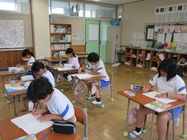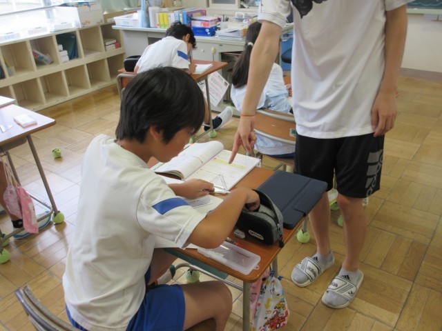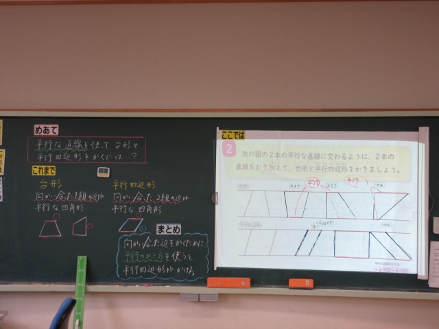 「平行な直線を使って、台形や平行四辺形をかくには」をめあてに学習に取り組みました。平行四辺形と台形の特徴を踏まえ、どのようにすれば台形や平行四辺形をかくことができるのか個々で考えました。自分がどのように書いたのか、三角定規を使って分かりやすく説明することができました。