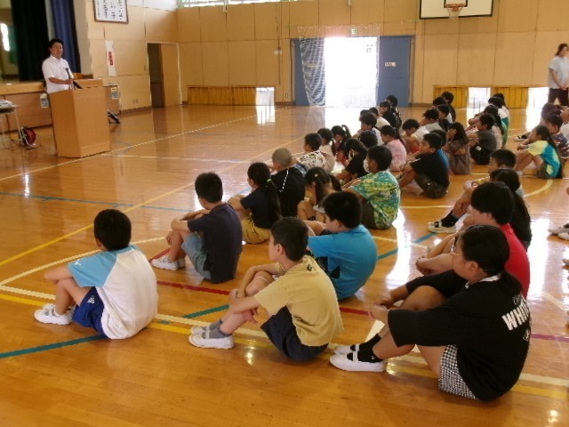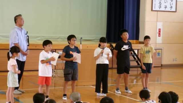 1学期の終業式を行いました。校長からは「1学期頑張ったこと」「夏休みのお願い」について話をしました。「夏休みのお願い」では、『経験は宝なり』という言葉を提示し、夏休みは色々なことに積極的にチャレンジしてくださいという話をしました。また、児童代表の言葉があり、頑張ったことの報告と2学期に向けての抱負が語られました。