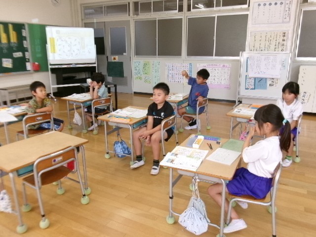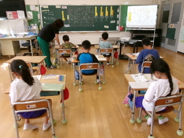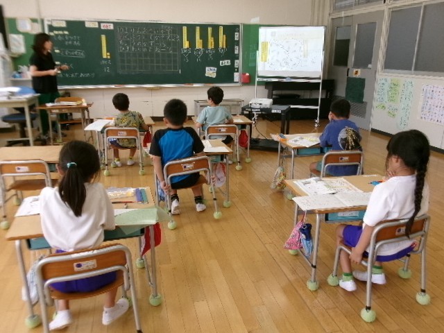 1年生は10より大きい数を工夫して数える学習をしていました。発表している人に体を向けながら話を聞いていました。「かずをかぞえるときは10ずつかこむ」と、子どもたちの言葉で学習のまとめをしました。