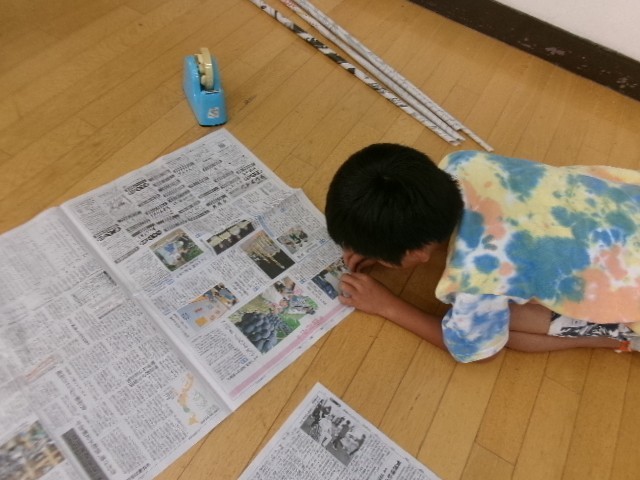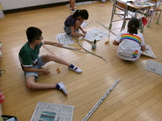 4年生は、新聞紙を丁寧に丸めていました。丸めた剣がたくさんできました。これからの学習で、部品をつなげて大きな作品をつくる予定です。何ができるか楽しみです。