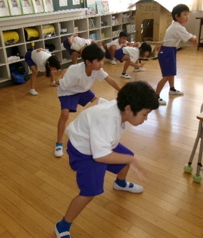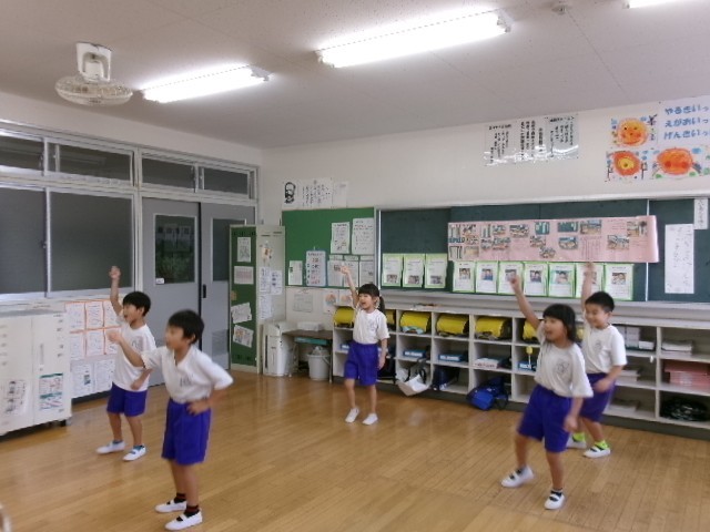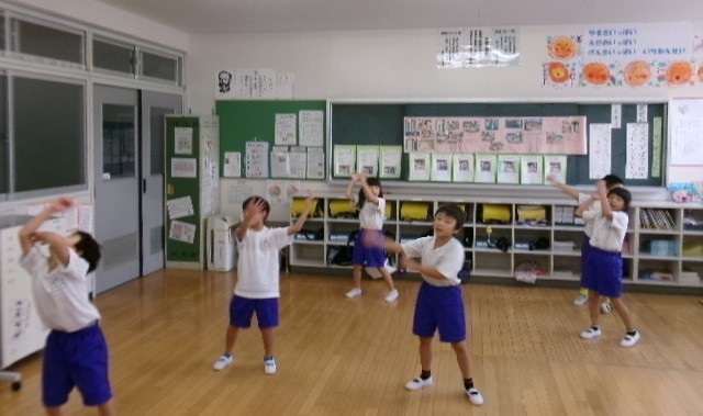 1年生は、熱中症対策で外遊びが出来なかったため教室で「ソーラン」を踊っていました。6年生のお手本の動画を見ながら、力強く表現していました。「どっこいしょ どっこいしょ。」「ソーラン ソーラン。」1年生の元気の良いかけ声が廊下まで響いていました。