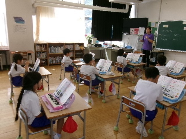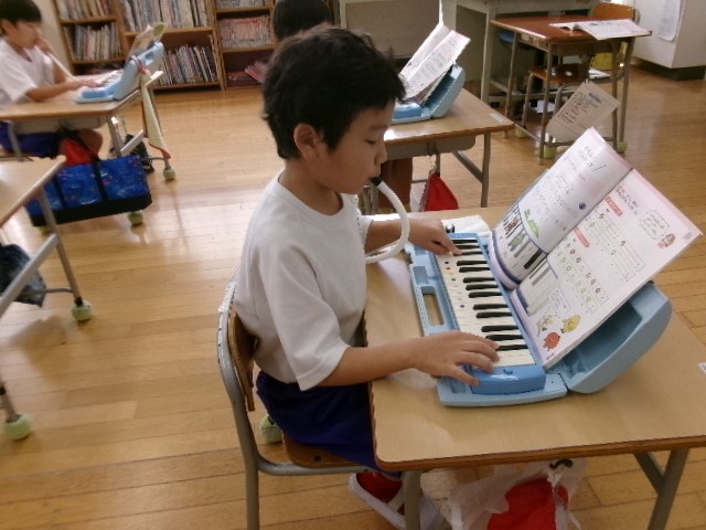 1年生は鍵盤ハーモニカで「ド」と「ソ」の音と友達になることをめあてに学習をしていました。長い音は空気をたくさん吸ってゆっくりと吹くことに気付いていました。良い姿勢でたくさん空気を吸ってきれいな音を響かせていました。