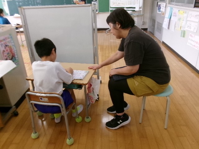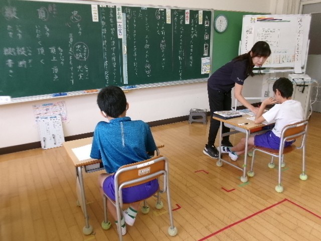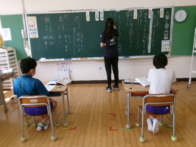 2年生は漢字の練習、6年生は、遊園地での人々の行動を文に書き発表する学習をしていました。