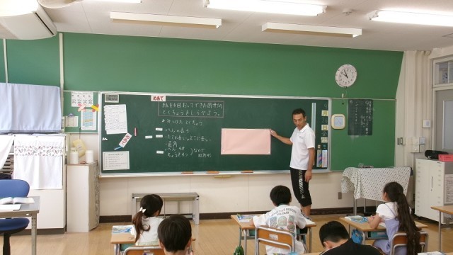 今日のめあては「紙を4回折ってできた図形のとくちょうをしらべよう」でした。「へんが4つある」「ちょうてんが4つある」「頂点は直角」などの気づきがありました。