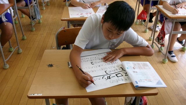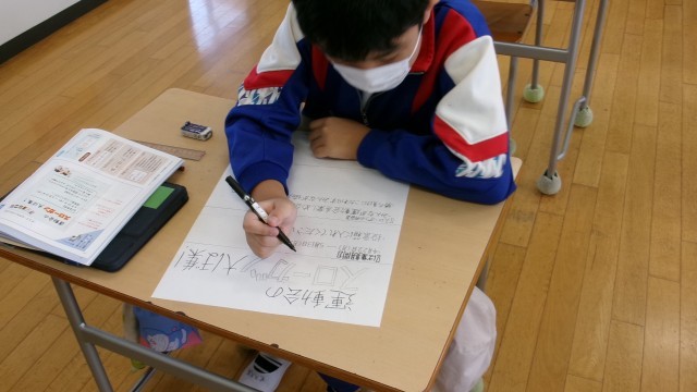 今日の書写はポスターづくりに挑戦しました。6年生の作品は流石と思うものが多く、児童達もやる気をもって取り組んでいました。