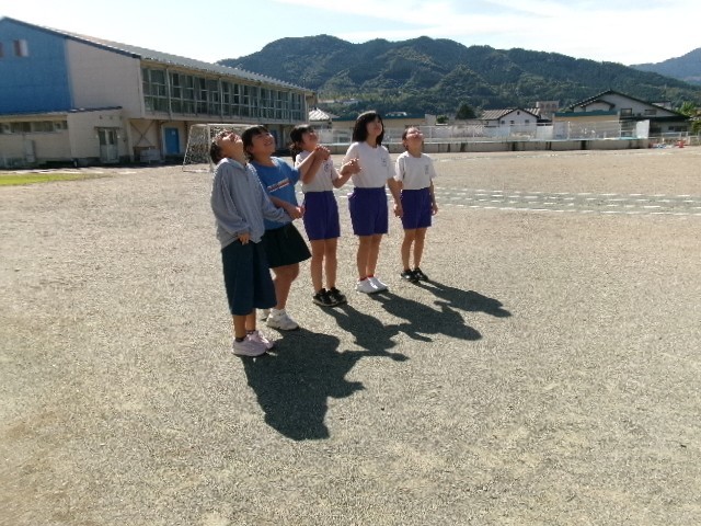 秋らしさを感じる季節になってきました。太陽の日差しも気持ちよい休み時間に、「かげおくり」をして遊んでいました。みんなで手をつなぎ「せーの!」「見えた!」