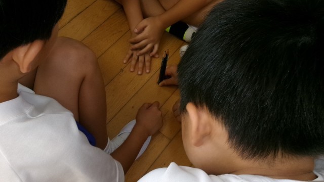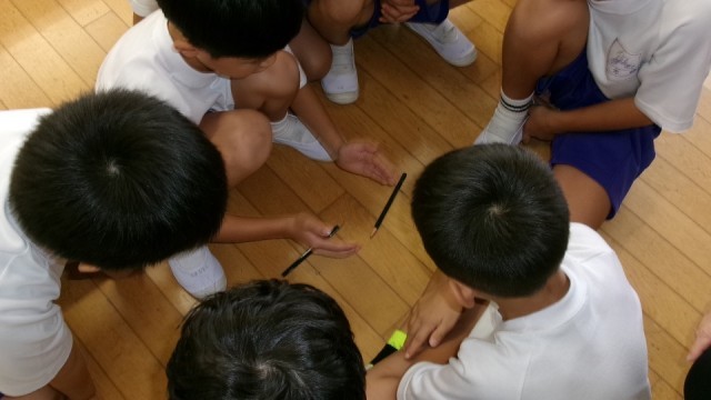今日は鉛筆の長さをどのようにくらべたらよいのかを考える時間でした。みんなで集まって意見を出し合いました。「手で片方の鉛筆の長さを計って・・・」「鉛筆を2本並べて、床で揃えて・・・」など活発に考えを発表していました。