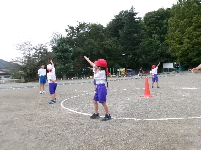 1、2年生は、運動会に向けて遊競技の練習をしていました。団ごとにリズムに合わせて踊ったり、玉を入れたりする練習をしました。どちらの団も元気いっぱい頑張っていました。運動会も今から楽しみです。