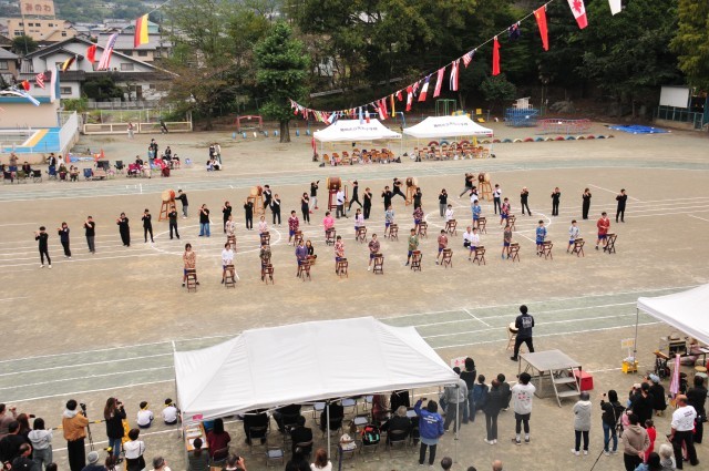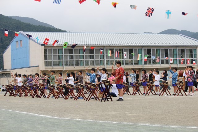 5、6年生と祭囃子保存会の皆様による「鬼石祭囃子」です。祭囃子保存会の皆様に、9月の終わりから土曜日の夜や日曜日の昼間など4回練習やリハーサルをしていただきました。地域の伝統を受け継いで、地域に貢献できる子どもたちに育っていって欲しいと思います。祭囃子保存会の皆様、ご指導ありがとうございました。