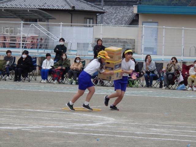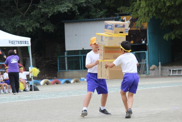 高学年の遊競技は「ダンダンボールキャッチ」です。4~6年生が力を合わせて段ボールを重ねて運んだり、ボールをかごに入れたりして競い合いました。2人で息を合わせて協力しながら走りました。