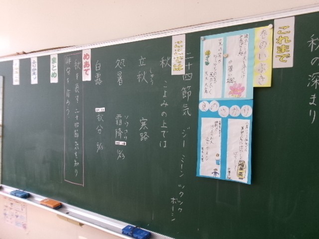 くわの実学級では、異学年の児童も一緒に学習しています。高学年の児童は、秋を表す二十四節気を知り、俳句を作る学習をしていました。「立秋」「秋分」「霜降」「処暑」「白露」など、自分で決めるとネームプレートを貼って共有しました。これからの学習で、季節を感じる俳句をつくるのが楽しみです。